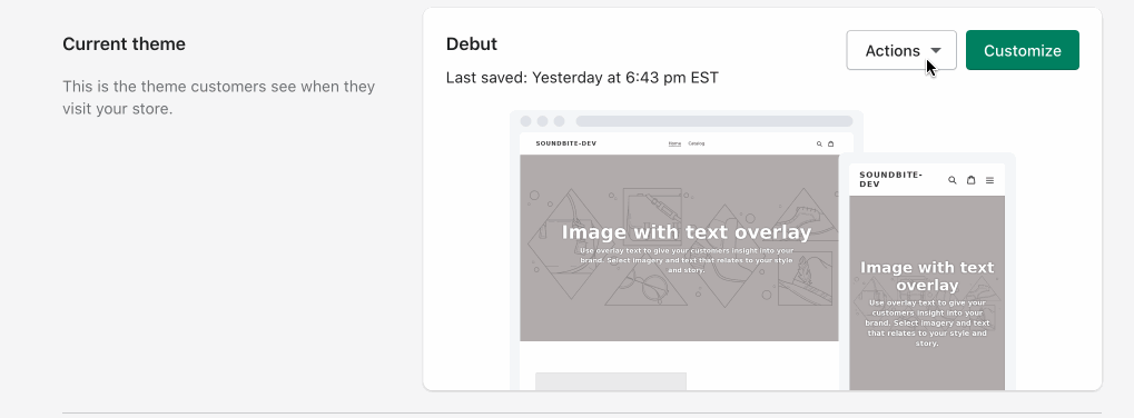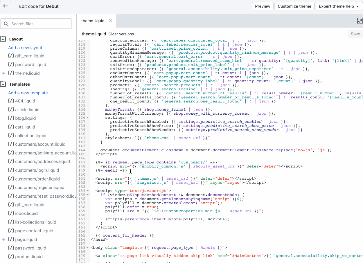 In this section we will modify the main Shopify theme file to add the JavaScript code necessary to add a recording widget to the page we will make later.