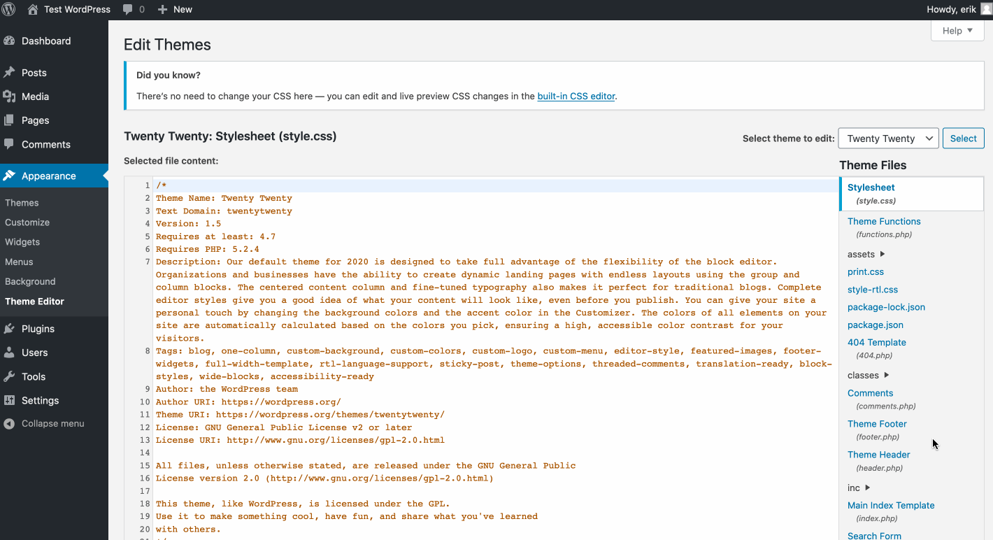 From the Wordpress administration control panel navigate on the left to Appearance and then to Theme Editor