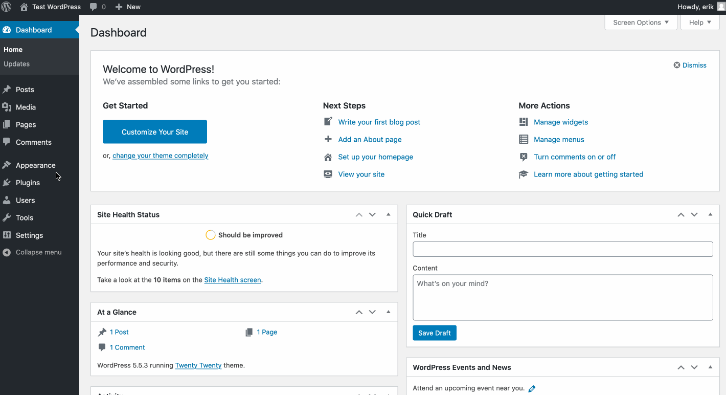 From the Wordpress administration contral page, click Pages and Add New. Enter a title for your page.
